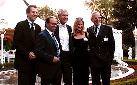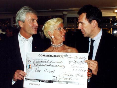 Flüge nach Dubai in das teuerste und höchste Suitenhotel der Welt am Jumeirah Beach. Die Benefiz-Verlosung und -Versteigerung erbrachten mit der vom Gastgeber von DM 31.136.- auf DM 33.333 Mark aufgrundeten Summe das höchste je erzielte Spendenergebnis einer Privat-Initiative in Deutschland, wie Dieter Pool vom Deutschen Kommitee der UNICEF ausdrücklich betonte. Initiator der Hilfsaktion für Kinder in Kiew war der Gala-Sänger und Multitalent Folkert Klaassen, der die ergreifenden Friedensmelodien seiner UNICEF-CD darbot und damit offensichtlich die Herzen der geladenen internationalen Gäste erreichte. ![]() Benefiz-Veranstalter mit Dieter Pool und UNICEF- Spendenscheck DM 33.333.- Foto: PURFOTO@AOL.COM Zu den aus Deutschland , der Schweiz und Spanien angereisten Gästen zählten u.a. die Präsidenten verschiedener karitativer und kultureller Verbände wie z.B. der Tschernobyl-Stiftung des Landes Niedersachsen Prof. Dr. med. Heyo Eckel, der Prädent der Club of Europe Helmut Becker, TV-bekannte Gesichter wie Tanja Schumann, Birgit Kick und Torsten Sleegers (RTL) oder auch die von vier Bodyguards begleitete, im Rolls Royce anreisende Box-Weltmeisterin Daisy Lang.