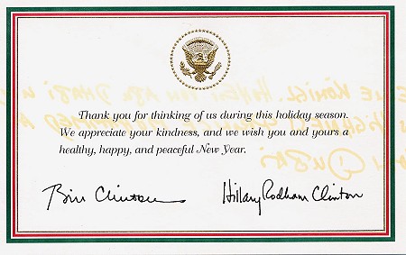 mit seiner Frau Hillary von New York aus Gesundheits-, Glück-und-Friedenswünsche an die Freunde in aller Welt. Zu den diesbezüglichen Gepflogenheiten seines