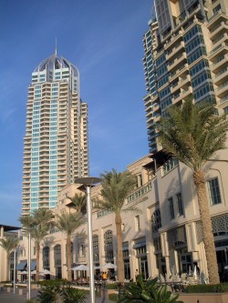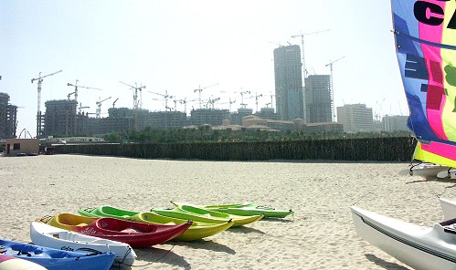 Jumeirah-Beach vertrieben werden. Zurzeit beherrschen riesige Kräne auf den in Rohbau befindlichen Wolkenkratzern das Bild, das sich hinter den Strandhotels der Meridien-Gruppe bis hin zum Sheraton erstreckt.. Am schlimmsten betroffen ist das edle Ritz Carlton am Jumeirah-Beach, das sich noch unlängst harmonisch in die Strandlandschaft einfügte, aber zwischen von den für künftige Touristen-Residenzen und Hotels in den Himmel wachsenden Bautürmen geradezu erdrückt wird. Hinter der "Strandlinie" entsteht eine Stadt aus der Retorte für mehr als 80.000 Menschen, die hier "Erholung oder ihren Ruhesitz finden wollen."