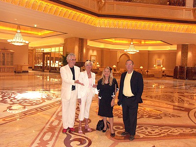 Offensichtlich trösten sich die Urlauber mit dem Gedanken, dass hier in etwa zwei Jahren vielleicht alles fertig gestellt sein könnte. Wie aus dem Management des Jumeirah-Beach-Hotels verlautet, sind in letzter Zeit zunehmend viele Urlauber von dem von der umliegenden Bauerei betroffenen (vormals besonders ruhigen und feinen) Ritz-Carlton in das bisher verschont gebliebene Jumeirah-Großhotel "geflüchtet". Mit dem Botschafterpaar Cappell, die ja vier Jahre lang in den Emiraten unzählige Kontakte geknüpft haben, On Tour zu sein, hat Seltenheitswert. Überall - auch von den im allgemeinen von feiner Zurückhaltung ausgezeichneten Very Important Locals - wird man herzlich begrüßt und aufgenommen.
