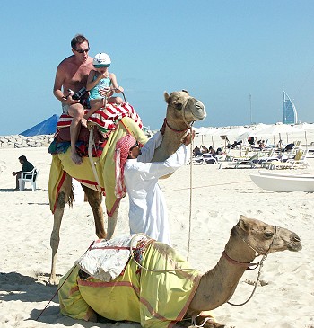 Derek Thomson, der Mann, der Jahr für Jahr das höchstdotierte Pferderennen der Welt von Dubai aus moderiert, stellt sich dem "Abenteuer" eines Ritts auf dem Rücken des Kamels. Die kleine Nichte des berühmten TV-Moderators allerdings hält offensichtlich nicht viel davon und will schon kurz darauf wieder vom Hochsitz hinunter auf die sichere Erde...des Jumeirah Beach am Royal Meridien Hotel. Im März 2004 zur Weltmeisterschaft, dem Dubai World Cup, startet im Königreich Dubai wieder das Rennen mit den kostbarsten Pferde der Welt, das Derek für Godolphin über den Chanel 4 über den Äther bringt. |