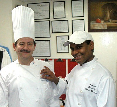 Da sich der Iranische Kaviar in nur einem Jahr um nahezu 1000 Prozent erhöht hatte, besorgte er unter größten Schwierigkeiten den Kaviar aus Russland zu einem "akzeptablen Preis". Die Gourmets unter den 1.500 Gäste der Royal-Meridien-Silvester-Party ließen sich denn auch andachtsvoll die schmackhaften Kaviar-Eier auf der Zunge zergehen. Einfach königlich! Königlich freuten sich auch Maitre Cuisinier Patrick und sein Sous-Chef über die Auszeichnung THE GOLDEN GLOBE; die Patrick vom Vizepräsidenten der Internationalen VIP-Loge entgegennahm. |