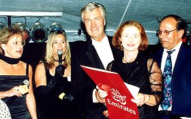 Flüge nach Dubai in das teuerste und höchste Suitenhotel der Welt am Jumeirah Beach. Die Benefiz-Verlosung und -Versteigerung erbrachten mit der vom Gastgeber von DM 31.136.- auf DM 33.333 Mark aufgrundeten Summe das höchste je erzielte Spendenergebnis einer Privat-Initiative in Deutschland, wie Dieter Pool vom Deutschen Kommitee der UNICEF ausdrücklich betonte. Initiator der Hilfsaktion für Kinder in Kiew war der Gala-Sänger und Multitalent Folkert Klaassen, der die ergreifenden Friedensmelodien seiner UNICEF-CD darbot und damit offensichtlich die Herzen der geladenen internationalen Gäste erreichte. ![]() Benefiz-Veranstalter mit Dieter Pool und UNICEF- Spendenscheck DM 33.333.- Foto: PURFOTO@AOL.COM Zu den aus Deutschland , der Schweiz und Spanien angereisten Gästen zählten u.a. die Präsidenten verschiedener karitativer und kultureller Verbände wie z.B. der Tschernobyl-Stiftung des Landes Niedersachsen Prof. Dr. med. Heyo Eckel, der Prädent der Club of Europe Helmut Becker, TV-bekannte Gesichter wie Tanja Schumann, Birgit Kick und Torsten Sleegers (RTL) oder auch die von vier Bodyguards begleitete, im Rolls Royce anreisende Box-Weltmeisterin Daisy Lang.